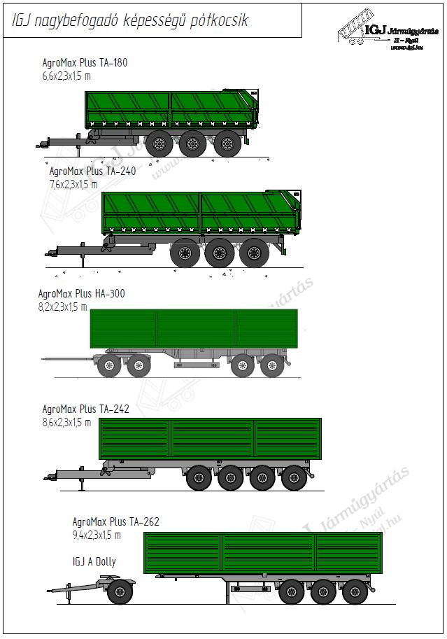 Nagy teherbírású és nagy befogadóképességű pótkocsik közép- és nagyüzemek, gazdaságok részére. Készülhetnek hullámos vagy erősített oldallal a felhasználási célnak megfelelően. Alkalmasak nehéz terepen való közlekedésre és távolsági szállításra egyaránt.